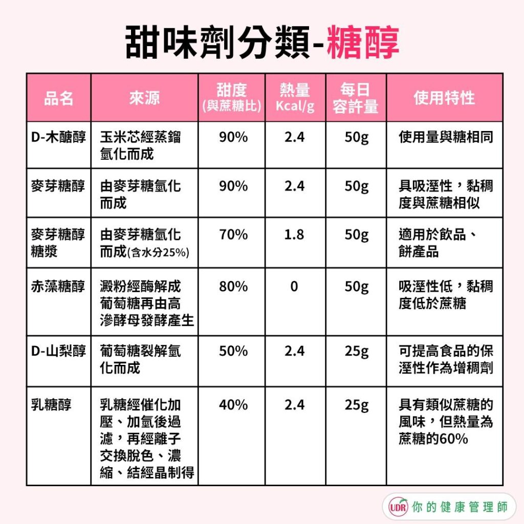 低熱量甜味劑,但加熱穩定性差。 - 赤藻糖醇(Erythritol)或甘露醇(Mannitol)